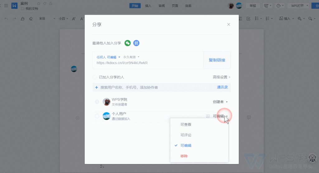 • 設定共享許可權:在生成文件連結時,WPS允許使用者設定訪問許可權。使用者可以選擇“只檢視”或“可編輯”許可權。選擇“只檢視”許可權時,其他人只能檢視文件內容,無法進行修改;選擇“可編輯”許可權時,其他協作者可以進行文件編輯,所有修改將即時同步。